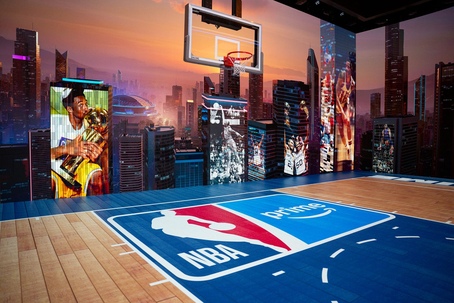 The NBA on Prime studio features an LED regulation half court and basketball hoop surrounded by ultra-high-resolution LED walls totaling 550 sq. ft. (2,300 LED tiles total).